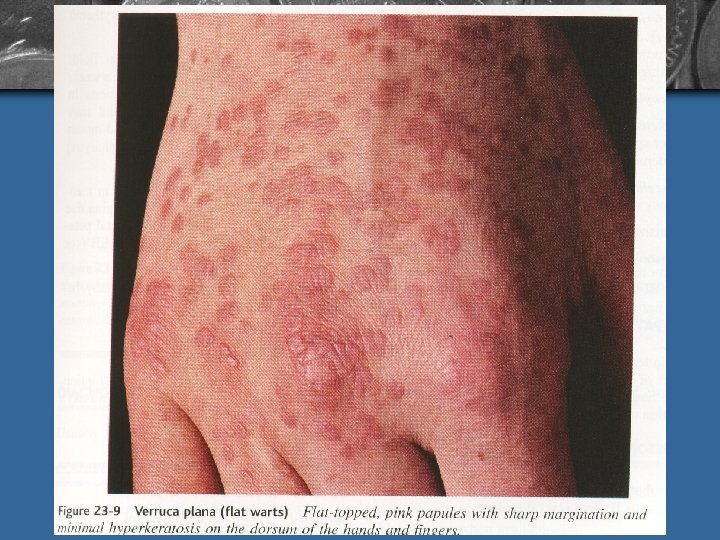 Veruka plana yuvenilis Anak, usia muda, dapat padaorang tua Liar, lentikular, permukaan licin and rata Warna sama dengan kulit atau kecoklatan Predileksi : muka, leher, dorsum manus dan pedis, pergelangan tangan and lutut Fenomena Kobnoer (+)