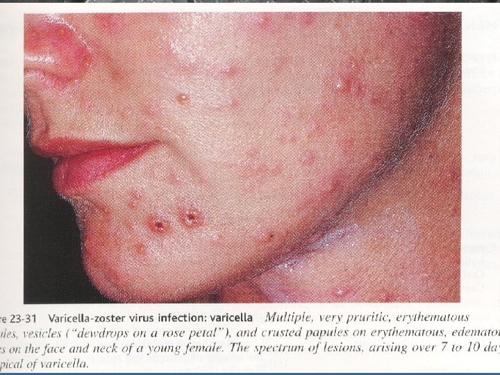 VARISELA CACAR AIR = CHICCKEN POX Infeksi akut primer oleh Virus Varisela-Zoster (VVZ) yang menyerang kulit and mukosa Disertai gejala konstitusi Kelainan kulit polimorfik Lokasi : sentral tubuh Anak, dewasa Transmisi : aerogen Masa penularan : 7 hari setelah timbul gejala kulit