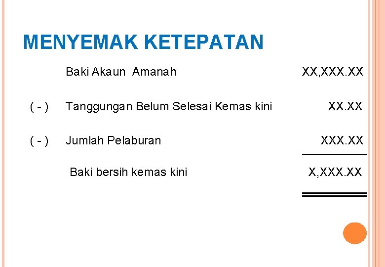 MENYEMAK KETEPATAN Baki Akaun Amanah (-) Tanggungan Belum Selesai Kemas kini (-) Jumlah Pelaburan Baki bersih kemas kini XX, XXX. XX X, XXX. XX