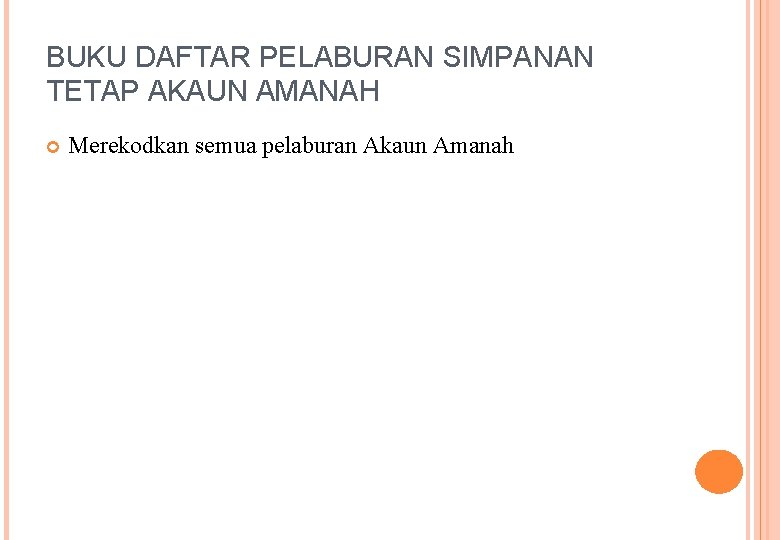 BUKU AKAUN AMANAH Satu rekod kewangan yang perlu diselenggarakan bagi merekodkan urusniaga Akaun Amanah Mengandungi maklumat Ø Terimaan Ø Bayaran Ø Tanggungan Ø Pelaburan Ø Baki berikut: