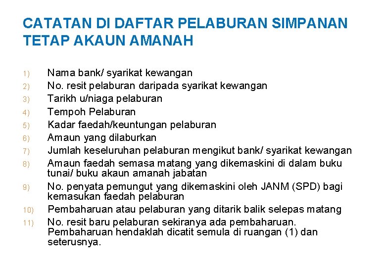 CATATAN DI DAFTAR PELABURAN SIMPANAN TETAP AKAUN AMANAH 1) 2) 3) 4) 5) 6) 7) 8) 9) 10) 11) Nama bank/ syarikat kewangan No. resit pelaburan daripada syarikat kewangan Tarikh u/niaga pelaburan Tempoh Pelaburan Kadar faedah/keuntungan pelaburan Amaun yang dilaburkan Jumlah keseluruhan pelaburan mengikut bank/ syarikat kewangan Amaun faedah semasa matang yang dikemaskini di dalam buku tunai/ buku akaun amanah jabatan No. penyata pemungut yang dikemaskini oleh JANM (SPD) bagi kemasukan faedah pelaburan Pembaharuan atau pelaburan yang ditarik balik selepas matang No. resit baru pelaburan sekiranya ada pembaharuan. Pembaharuan hendaklah dicatit semula di ruangan (1) dan seterusnya.