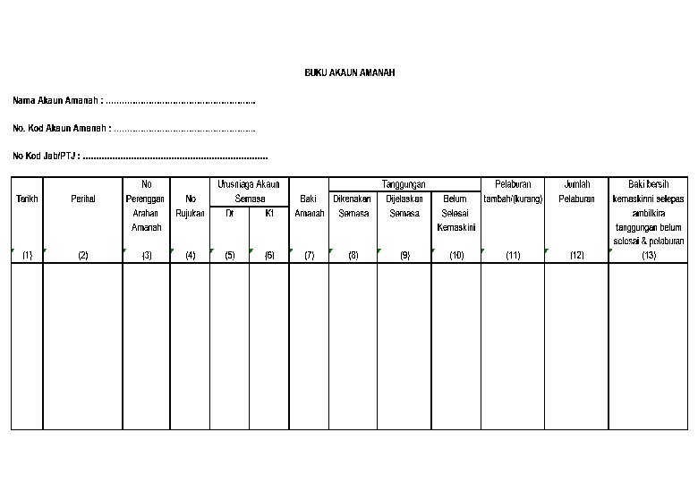 CATATAN DI BUKU AKAUN AMANAH (1) Tarikh dokumen berkenaan (2) Ringkasan urus niaga (3) No. perenggan terimaan/bayaran mengikut Arahan Amanah (4) No. ruj. Dokumen- no. resit, no. baucar dsb. (5) Amaun urus niaga semasa untuk perbelanjaan (6) Amaun urus niaga semasa untuk terimaan (7) Baki A/k Amanah (8) Perbelanjaan yang dipertanggungkan ke akaun (9) Tanggungan yang dibayar (10) Tanggungan yang BELUM dijelaskan (11) Tambahan/ pengeluaran akaun pelaburan (12) Jumlah pelaburan bersih pada tarikh semasa (13) Baki bersih kemas kini A/k Amanah (baki SEBENAR yang boleh dibelanjakan)