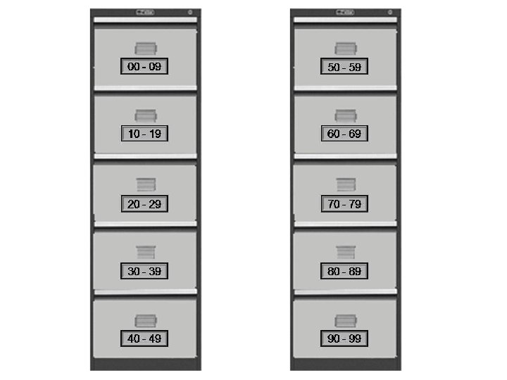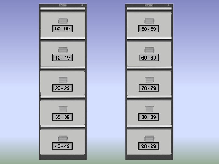 Surat pertama dicatat dalam buku arsip dengan nomor kode 0001, surat kedua 0002, surat ketiga 0003, dan seterusnya. 2) Filing cabinet, yang mempunyai laci 10, pada laci dicantumkan kode-kode berikut. a) Laci pertama diberi kode 00 -09 b) Laci kedua diberi kode 10 -19 c) … dan seterusnya sampai … d) Laci kesepuluh, berkode 90 -99
