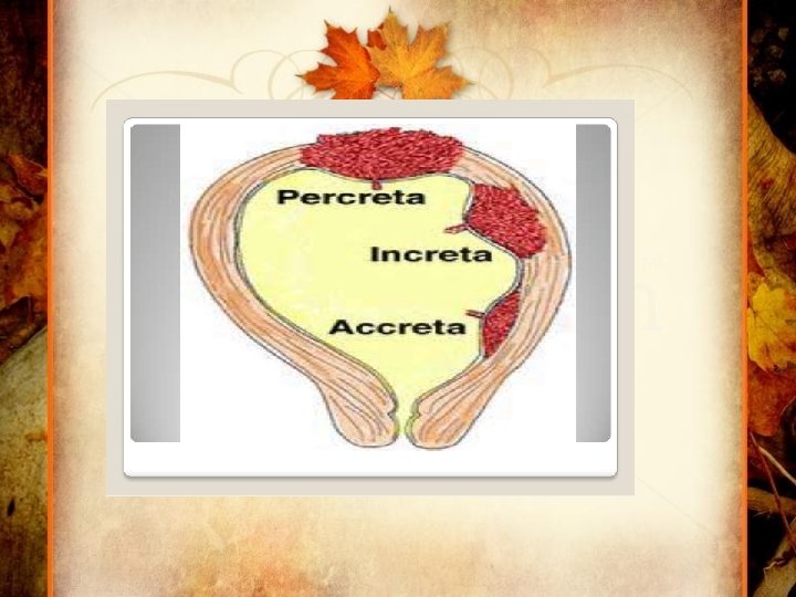 Perlekatan plasenta: 1. Plasenta adhesive : plasenta yang melekat pada desidua endometrium lebih dalam. 2. Plasenta inkerta : vili khorialis tumbuh lebih dalam dan menembus desidua endometrium sampai ke miometrium. 3. Plasenta akreta : vili khorialis tumbuh menembus miometrium sampai ke serosa. 4. Plasenta perkreta : vili khorialis tumbuh menembuus serosa atau peritoneum dinding rahim.