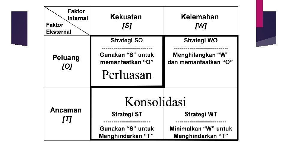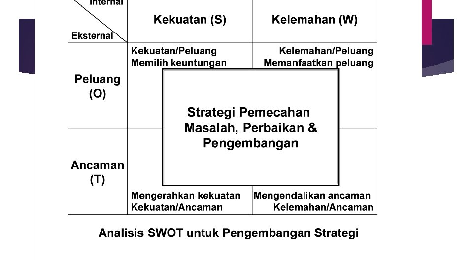 5: Tentukan prioritas penanganan kelemahan dan ancaman itu, dan susunlah suatu rencana tindakan untuk melaksanakan program penanganan. Jika kekuatan lebih besar dari kelemahan, dan peluang lebih baik dari ancaman, maka strategi pengembangan diarahkan kepada perluasan/pengembangan program Jika kekuatan lebih kecil dari kelemahan, dan peluang lebih kecil dari ancaman, maka strategi pengembangan lebih ditekankan kepada upaya konsolidasi ke dalam (penataan organisasi dengan memanfaatkan kekuatan dan peluang, dan mereduksi kelemahan di dalam dan ancaman dari luar)
