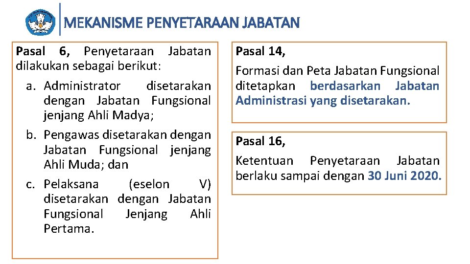 MEKANISME PENYETARAAN JABATAN Pasal 6, Penyetaraan Jabatan dilakukan sebagai berikut: a. Administrator disetarakan dengan Jabatan Fungsional jenjang Ahli Madya; b. Pengawas disetarakan dengan Jabatan Fungsional jenjang Ahli Muda; dan c. Pelaksana (eselon V) disetarakan dengan Jabatan Fungsional Jenjang Ahli Pertama. Pasal 14, Formasi dan Peta Jabatan Fungsional ditetapkan berdasarkan Jabatan Administrasi yang disetarakan. Pasal 16, Ketentuan Penyetaraan Jabatan berlaku sampai dengan 30 Juni 2020.