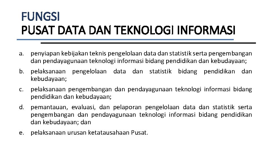 FUNGSI PUSAT DATA DAN TEKNOLOGI INFORMASI a. penyiapan kebijakan teknis pengelolaan data dan statistik serta pengembangan dan pendayagunaan teknologi informasi bidang pendidikan dan kebudayaan; b. pelaksanaan pengelolaan data dan statistik bidang pendidikan dan kebudayaan; c. pelaksanaan pengembangan dan pendayagunaan teknologi informasi bidang pendidikan dan kebudayaan; d. pemantauan, evaluasi, dan pelaporan pengelolaan data dan statistik serta pengembangan dan pendayagunaan teknologi informasi bidang pendidikan dan kebudayaan; dan e. pelaksanaan urusan ketatausahaan Pusat.