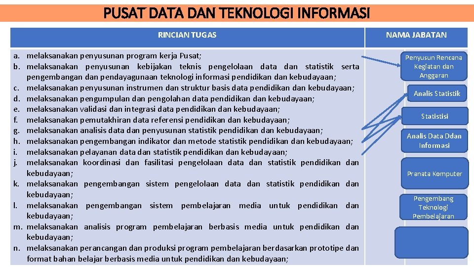PUSAT DATA DAN TEKNOLOGI INFORMASI RINCIAN TUGAS a. melaksanakan penyusunan program kerja Pusat; b. melaksanakan penyusunan kebijakan teknis pengelolaan data dan statistik serta pengembangan dan pendayagunaan teknologi informasi pendidikan dan kebudayaan; c. melaksanakan penyusunan instrumen dan struktur basis data pendidikan dan kebudayaan; d. melaksanakan pengumpulan dan pengolahan data pendidikan dan kebudayaan; e. melaksanakan validasi dan integrasi data pendidikan dan kebudayaan; f. melaksanakan pemutakhiran data referensi pendidikan dan kebudayaan; g. melaksanakan analisis data dan penyusunan statistik pendidikan dan kebudayaan; h. melaksanakan pengembangan indikator dan metode statistik pendidikan dan kebudayaan; i. melaksanakan pelayanan data dan statistik pendidikan dan kebudayaan; j. melaksanakan koordinasi dan fasilitasi pengelolaan data dan statistik pendidikan dan kebudayaan; k. melaksanakan pengembangan sistem pengelolaan data dan statistik pendidikan dan kebudayaan; l. melaksanakan pengembangan sistem pembelajaran media untuk pendidikan dan kebudayaan; m. melaksanakan analisis program pembelajaran berbasis media untuk pendidikan dan kebudayaan; n. melaksanakan perancangan dan produksi program pembelajaran berdasarkan prototipe dan format bahan belajar berbasis media untuk pendidikan dan kebudayaan; NAMA JABATAN Penyusun Rencana Kegiatan dan Anggaran Analis Statistik Statistisi Analis Data Ddan Informasi Pranata Komputer Pengembang Teknologi Pembelajaran