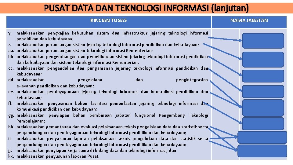PUSAT DATA DAN TEKNOLOGI INFORMASI (lanjutan) RINCIAN TUGAS y. melaksanakan pengkajian kebutuhan sistem dan infrastruktur jejaring teknologi informasi pendidikan dan kebudayaan; z. melaksanakan perancangan sistem jejaring teknologi informasi pendidikan dan kebudayaan; aa. melaksanakan perancangan sistem teknologi informasi Kementerian; bb. melaksanakan pengembangan dan pemeliharaan sistem jejaring teknologi informasi pendidikan dan kebudayaan dan sistem teknologi informasi Kementerian; cc. melaksanakan pengendalian dan pengamanan jejaring teknologi informasi pendidikan dan kebudayaan; dd. melaksanakan pengelolaan dan pengintegrasian e-layanan pendidikan dan kebudayaan; ee. melaksanakan pendayagunaan jejaring teknologi informasi dan komunikasi pendidikan dan kebudayaan; ff. melaksanakan penyusunan bahan fasilitasi pemanfaatan jejaring teknologi informasi dan komunikasi pendidikan dan kebudayaan; gg. melaksanakan penyiapan bahan pembinaan jabatan fungsional Pengembang Teknologi Pembelajaran; hh. melaksanakan pemantauan dan evaluasi pelaksanaan teknis pengelolaan data dan statistik serta pengembangan dan pendayagunaan teknologi informasi pendidikan dan kebudayaan; ii. melaksanakan penyusunan laporan pelaksanaan teknis pengelolaan data dan statistik serta pengembangan dan pendayagunaan teknologi informasi pendidikan dan kebudayaan; jj. melaksanakan penyiapan kerja sama di bidang data dan teknologi informasi; dan kk. melaksanakan penyusunan laporan Pusat. NAMA JABATAN