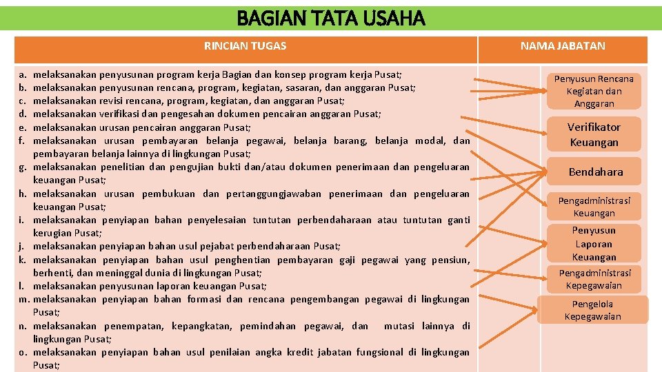 BAGIAN TATA USAHA RINCIAN TUGAS a. b. c. d. e. f. melaksanakan penyusunan program kerja Bagian dan konsep program kerja Pusat; melaksanakan penyusunan rencana, program, kegiatan, sasaran, dan anggaran Pusat; melaksanakan revisi rencana, program, kegiatan, dan anggaran Pusat; melaksanakan verifikasi dan pengesahan dokumen pencairan anggaran Pusat; melaksanakan urusan pembayaran belanja pegawai, belanja barang, belanja modal, dan pembayaran belanja lainnya di lingkungan Pusat; g. melaksanakan penelitian dan pengujian bukti dan/atau dokumen penerimaan dan pengeluaran keuangan Pusat; h. melaksanakan urusan pembukuan dan pertanggungjawaban penerimaan dan pengeluaran keuangan Pusat; i. melaksanakan penyiapan bahan penyelesaian tuntutan perbendaharaan atau tuntutan ganti kerugian Pusat; j. melaksanakan penyiapan bahan usul pejabat perbendaharaan Pusat; k. melaksanakan penyiapan bahan usul penghentian pembayaran gaji pegawai yang pensiun, berhenti, dan meninggal dunia di lingkungan Pusat; l. melaksanakan penyusunan laporan keuangan Pusat; m. melaksanakan penyiapan bahan formasi dan rencana pengembangan pegawai di lingkungan Pusat; n. melaksanakan penempatan, kepangkatan, pemindahan pegawai, dan mutasi lainnya di lingkungan Pusat; o. melaksanakan penyiapan bahan usul penilaian angka kredit jabatan fungsional di lingkungan Pusat; NAMA JABATAN Penyusun Rencana Kegiatan dan Anggaran Verifikator Keuangan Bendahara Pengadministrasi Keuangan Penyusun Laporan Keuangan Pengadministrasi Kepegawaian Pengelola Kepegawaian