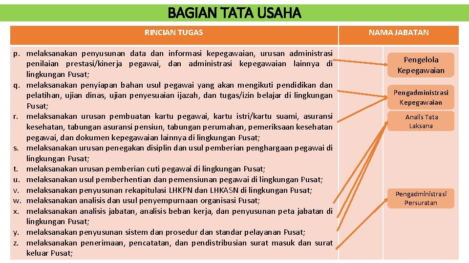 BAGIAN TATA USAHA RINCIAN TUGAS p. melaksanakan penyusunan data dan informasi kepegawaian, urusan administrasi penilaian prestasi/kinerja pegawai, dan administrasi kepegawaian lainnya di lingkungan Pusat; q. melaksanakan penyiapan bahan usul pegawai yang akan mengikuti pendidikan dan pelatihan, ujian dinas, ujian penyesuaian ijazah, dan tugas/izin belajar di lingkungan Pusat; r. melaksanakan urusan pembuatan kartu pegawai, kartu istri/kartu suami, asuransi kesehatan, tabungan asuransi pensiun, tabungan perumahan, pemeriksaan kesehatan pegawai, dan dokumen kepegawaian lainnya di lingkungan Pusat; s. melaksanakan urusan penegakan disiplin dan usul pemberian penghargaan pegawai di lingkungan Pusat; t. melaksanakan urusan pemberian cuti pegawai di lingkungan Pusat; u. melaksanakan usul pemberhentian dan pemensiunan pegawai di lingkungan Pusat; v. melaksanakan penyusunan rekapitulasi LHKPN dan LHKASN di lingkungan Pusat; w. melaksanakan analisis dan usul penyempurnaan organisasi Pusat; x. melaksanakan analisis jabatan, analisis beban kerja, dan penyusunan peta jabatan di lingkungan Pusat; y. melaksanakan penyusunan sistem dan prosedur dan standar pelayanan Pusat; z. melaksanakan penerimaan, pencatatan, dan pendistribusian surat masuk dan surat keluar Pusat; NAMA JABATAN Pengelola Kepegawaian Pengadministrasi Kepegawaian Analis Tata Laksana Pengadministrasi Persuratan