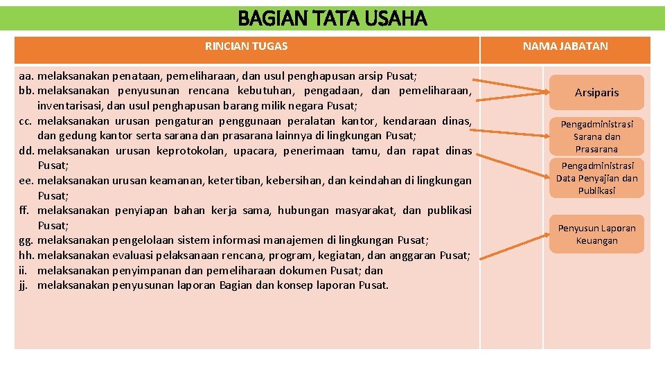 BAGIAN TATA USAHA RINCIAN TUGAS aa. melaksanakan penataan, pemeliharaan, dan usul penghapusan arsip Pusat; bb. melaksanakan penyusunan rencana kebutuhan, pengadaan, dan pemeliharaan, inventarisasi, dan usul penghapusan barang milik negara Pusat; cc. melaksanakan urusan pengaturan penggunaan peralatan kantor, kendaraan dinas, dan gedung kantor serta sarana dan prasarana lainnya di lingkungan Pusat; dd. melaksanakan urusan keprotokolan, upacara, penerimaan tamu, dan rapat dinas Pusat; ee. melaksanakan urusan keamanan, ketertiban, kebersihan, dan keindahan di lingkungan Pusat; ff. melaksanakan penyiapan bahan kerja sama, hubungan masyarakat, dan publikasi Pusat; gg. melaksanakan pengelolaan sistem informasi manajemen di lingkungan Pusat; hh. melaksanakan evaluasi pelaksanaan rencana, program, kegiatan, dan anggaran Pusat; ii. melaksanakan penyimpanan dan pemeliharaan dokumen Pusat; dan jj. melaksanakan penyusunan laporan Bagian dan konsep laporan Pusat. NAMA JABATAN Arsiparis Pengadministrasi Sarana dan Prasarana Pengadministrasi Data Penyajian dan Publikasi Penyusun Laporan Keuangan