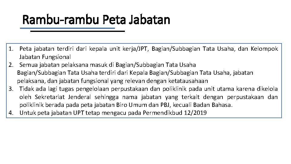 Rambu-rambu Peta Jabatan 1. Peta jabatan terdiri dari kepala unit kerja/JPT, Bagian/Subbagian Tata Usaha, dan Kelompok Jabatan Fungsional 2. Semua jabatan pelaksana masuk di Bagian/Subbagian Tata Usaha terdiri dari Kepala Bagian/Subbagian Tata Usaha, jabatan pelaksana, dan jabatan fungsional yang relevan dengan ketatausahaan 3. Tidak ada lagi tugas pengelolaan perpustakaan dan poliklinik pada unit utama karena dikelola oleh Sekretariat Jenderal sehingga nama jabatan yang terkait dengan perpustakaan dan poliklinik berada peta jabatan Biro Umum dan PBJ, kecuali Badan Bahasa. 4. Untuk peta jabatan UPT tetap mengacu pada Permendikbud 12/2019