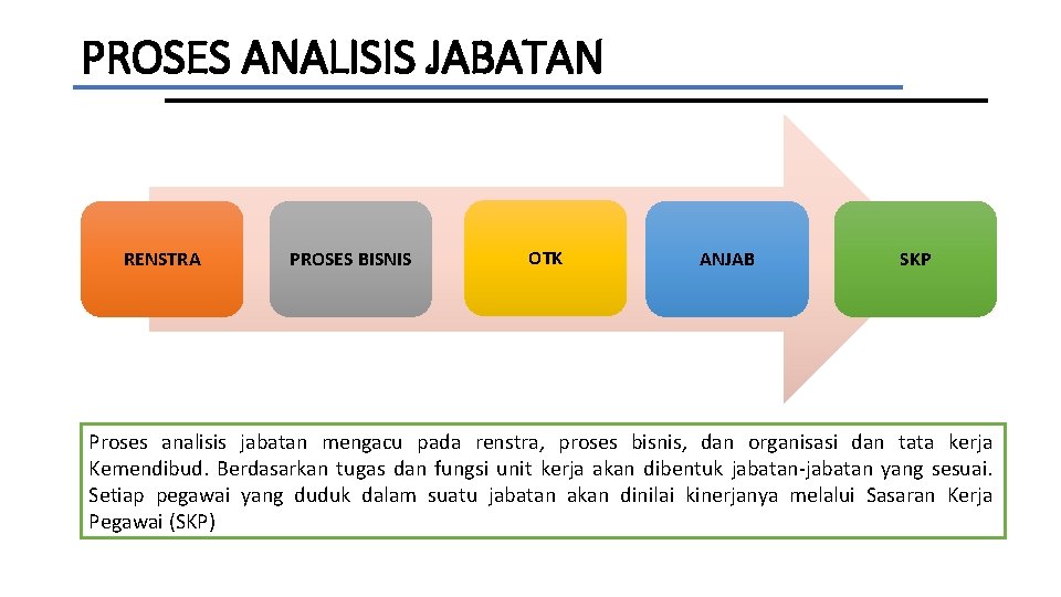 PROSES ANALISIS JABATAN RENSTRA PROSES BISNIS OTK ANJAB SKP Proses analisis jabatan mengacu pada renstra, proses bisnis, dan organisasi dan tata kerja Kemendibud. Berdasarkan tugas dan fungsi unit kerja akan dibentuk jabatan-jabatan yang sesuai. Setiap pegawai yang duduk dalam suatu jabatan akan dinilai kinerjanya melalui Sasaran Kerja Pegawai (SKP)