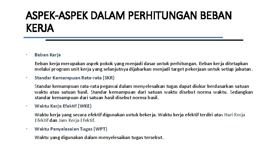 ASPEK-ASPEK DALAM PERHITUNGAN BEBAN KERJA Beban Kerja Beban kerja merupakan aspek pokok yang menjadi dasar untuk perhitungan. Beban kerja ditetapkan melalui program unit kerja yang selanjutnya dijabarkan menjadi target pekerjaan untuk setiap jabatan. Standar Kemampuan Rata-rata (SKR) Standar kemampuan rata-rata pegawai dalam menyelesaikan tugas dapat diukur berdasarkan satuan waktu atau satuan hasil. Standar kemampuan dari satuan waktu disebut norma waktu. Sedangkan standar kemampuan dari satuan hasil disebut norma hasil. Waktu Kerja Efektif (WKE) Waktu kerja yang secara efektif digunakan untuk bekerja. Waktu kerja efektif terdiri atas Hari Kerja Efektif dan Jam Kerja Efektif. Waktu Penyelesaian Tugas (WPT) Waktu yang digunakan dalam menyelesaikan tugas tersebut.