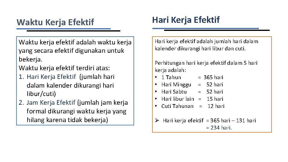 Waktu Kerja Efektif Waktu kerja efektif adalah waktu kerja yang secara efektif digunakan untuk bekerja. Waktu kerja efektif terdiri atas: 1. Hari Kerja Efektif (jumlah hari dalam kalender dikurangi hari libur/cuti) 2. Jam Kerja Efektif (jumlah jam kerja formal dikurangi waktu kerja yang hilang karena tidak bekerja) Hari Kerja Efektif Hari kerja efektif adalah jumlah hari dalam kalender dikurangi hari libur dan cuti. Perhitungan hari kerja efektif dalam 5 hari kerja adalah: • 1 Tahun = 365 hari • Hari Minggu = 52 hari • Hari Sabtu = 52 hari • Hari libur lain = 15 hari • Cuti Tahunan = 12 hari Ø Hari kerja efektif = 365 hari – 131 hari = 234 hari.