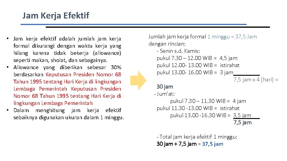 Jam Kerja Efektif • Jam kerja efektif adalah jumlah jam kerja formal dikurangi dengan waktu kerja yang hilang karena tidak bekerja (allowance) seperti makan, sholat, dan sebagainya. • Allowance yang diberikan sebesar 30% berdasarkan Keputusan Presiden Nomor 68 Tahun 1995 tentang Hari Kerja di lingkungan Lembaga Pemerintah • Dalam menghitung jam kerja efektif sebaiknya digunakan ukuran dalam 1 minggu. Jumlah jam kerja formal 1 minggu = 37, 5 Jam dengan rincian: - Senin s. d. Kamis: pukul 7. 30 – 12. 00 WIB = 4, 5 jam pukul 12. 00 - 13. 00 WIB = istirahat pukul 13. 00 - 16. 00 WIB = 3 jam 7, 5 jam x 4 (hari) = 30 jam - Jum’at: pukul 7. 30 – 11. 30 WIB = 4 jam pukul 11. 30 -13. 00 WIB = istirahat pukul 13. 00 -16. 30 WIB = 3, 5 jam 7, 5 jam - Total jam kerja efektif 1 minggu: 30 jam + 7, 5 jam = 37, 5 jam