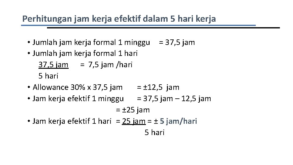 Perhitungan jam kerja efektif dalam 5 hari kerja • Jumlah jam kerja formal 1 minggu = 37, 5 jam • Jumlah jam kerja formal 1 hari 37, 5 jam = 7, 5 jam /hari 5 hari • Allowance 30% x 37, 5 jam = ± 12, 5 jam • Jam kerja efektif 1 minggu = 37, 5 jam – 12, 5 jam = ± 25 jam • Jam kerja efektif 1 hari = 25 jam = ± 5 jam/hari 5 hari