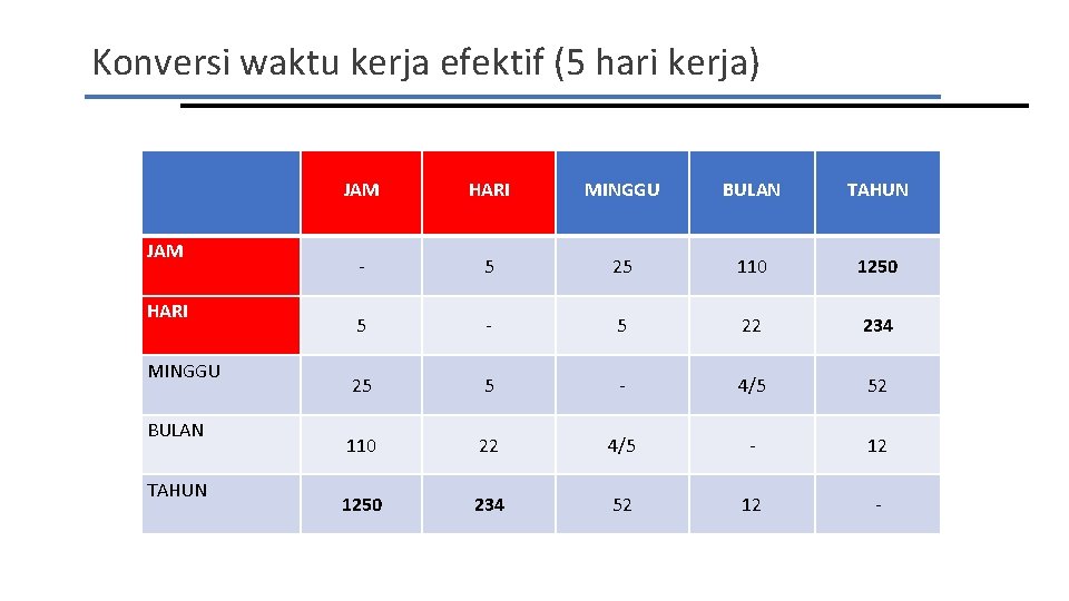 Konversi waktu kerja efektif (5 hari kerja) JAM HARI MINGGU BULAN TAHUN - 5 25 110 1250 5 - 5 22 234 25 5 - 4/5 52 110 22 4/5 - 12 1250 234 52 12 -