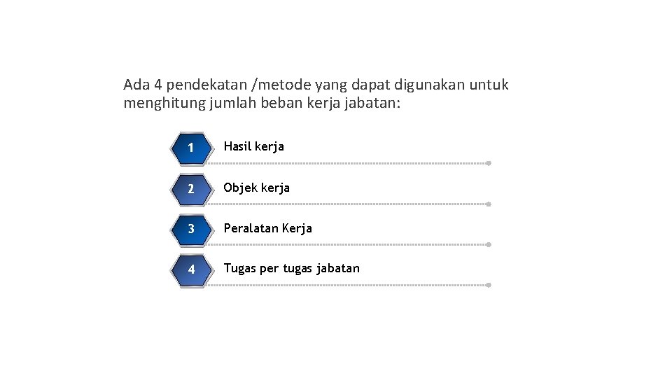 Ada 4 pendekatan /metode yang dapat digunakan untuk menghitung jumlah beban kerja jabatan: 1 Hasil kerja 2 Objek kerja 3 Peralatan Kerja 4 Tugas per tugas jabatan