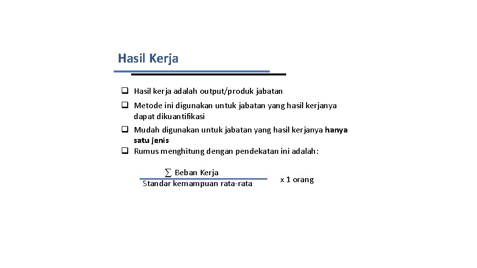 Hasil Kerja q Hasil kerja adalah output/produk jabatan q Metode ini digunakan untuk jabatan yang hasil kerjanya dapat dikuantifikasi q Mudah digunakan untuk jabatan yang hasil kerjanya hanya satu jenis q Rumus menghitung dengan pendekatan ini adalah: ∑ Beban Kerja Standar kemampuan rata-rata x 1 orang