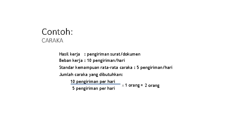 Contoh: CARAKA Hasil kerja : pengiriman surat/dokumen Beban kerja : 10 pengiriman/hari Standar kemampuan rata-rata caraka : 5 pengiriman/hari Jumlah caraka yang dibutuhkan: 10 pengiriman per hari 5 pengiriman per hari x 1 orang = 2 orang