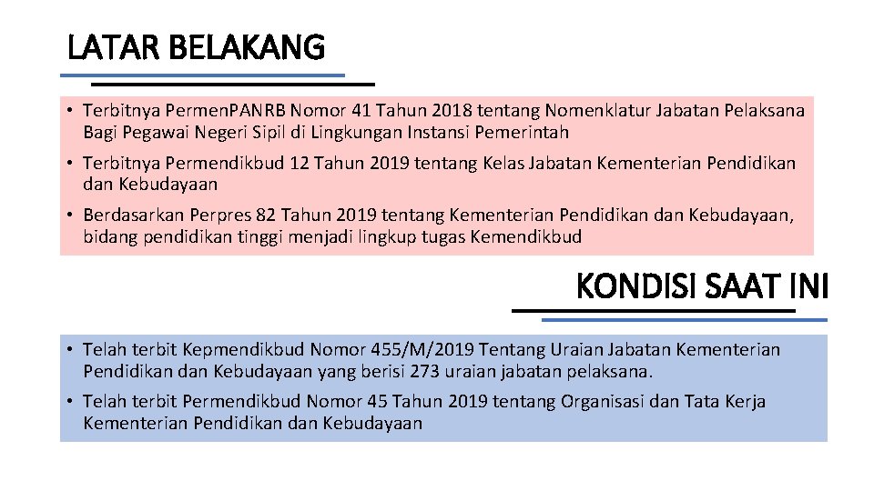LATAR BELAKANG • Terbitnya Permen. PANRB Nomor 41 Tahun 2018 tentang Nomenklatur Jabatan Pelaksana Bagi Pegawai Negeri Sipil di Lingkungan Instansi Pemerintah • Terbitnya Permendikbud 12 Tahun 2019 tentang Kelas Jabatan Kementerian Pendidikan dan Kebudayaan • Berdasarkan Perpres 82 Tahun 2019 tentang Kementerian Pendidikan dan Kebudayaan, bidang pendidikan tinggi menjadi lingkup tugas Kemendikbud KONDISI SAAT INI • Telah terbit Kepmendikbud Nomor 455/M/2019 Tentang Uraian Jabatan Kementerian Pendidikan dan Kebudayaan yang berisi 273 uraian jabatan pelaksana. • Telah terbit Permendikbud Nomor 45 Tahun 2019 tentang Organisasi dan Tata Kerja Kementerian Pendidikan dan Kebudayaan