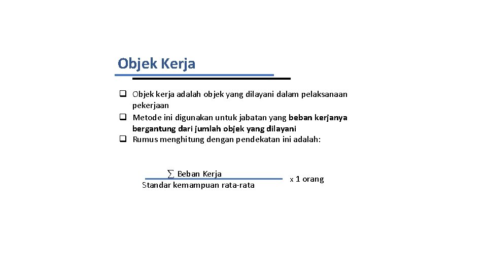 Objek Kerja q Objek kerja adalah objek yang dilayani dalam pelaksanaan pekerjaan q Metode ini digunakan untuk jabatan yang beban kerjanya bergantung dari jumlah objek yang dilayani q Rumus menghitung dengan pendekatan ini adalah: ∑ Beban Kerja Standar kemampuan rata-rata x 1 orang