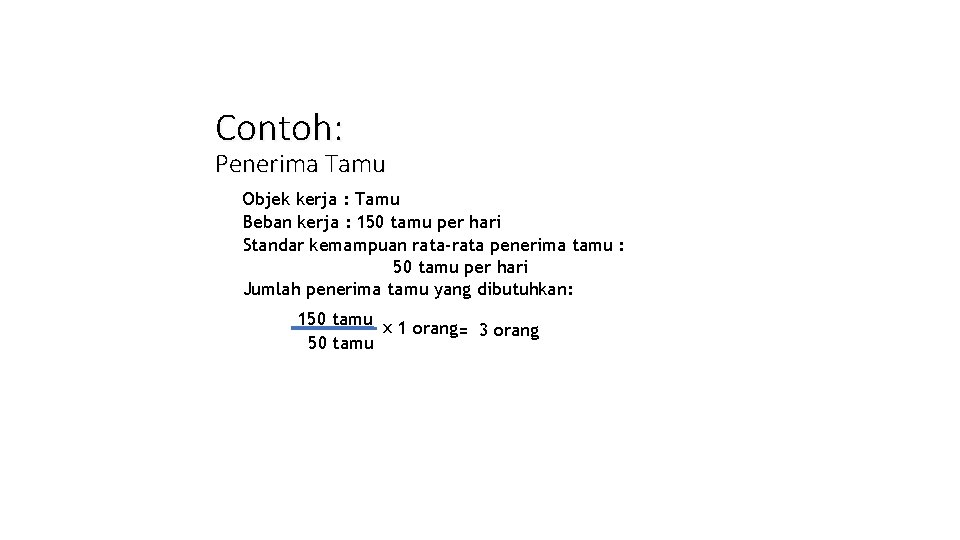 Contoh: Penerima Tamu Objek kerja : Tamu Beban kerja : 150 tamu per hari Standar kemampuan rata-rata penerima tamu : 50 tamu per hari Jumlah penerima tamu yang dibutuhkan: 150 tamu x 1 orang = 3 orang 50 tamu