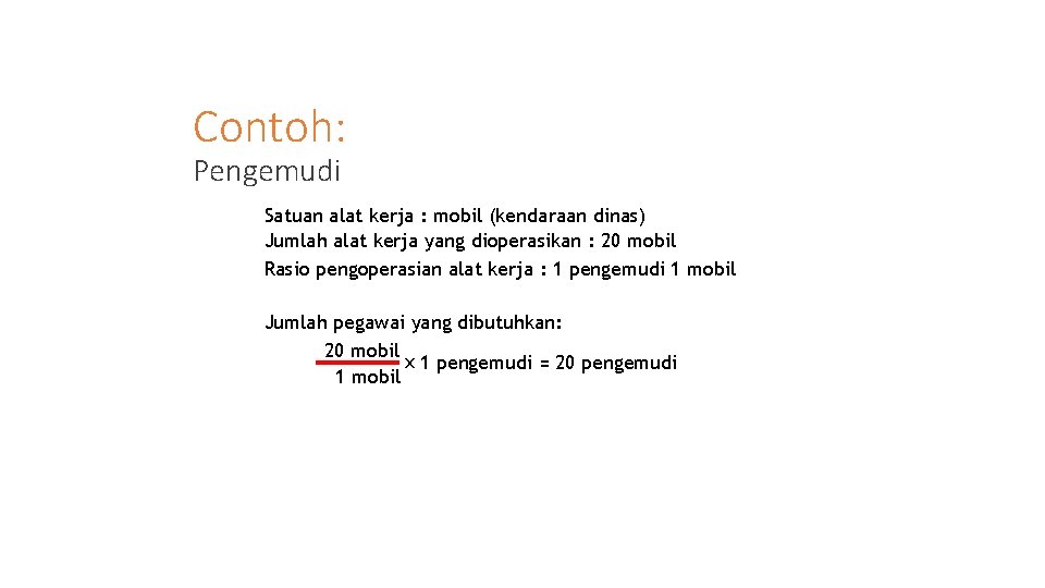 Contoh: Pengemudi Satuan alat kerja : mobil (kendaraan dinas) Jumlah alat kerja yang dioperasikan : 20 mobil Rasio pengoperasian alat kerja : 1 pengemudi 1 mobil Jumlah pegawai yang dibutuhkan: 20 mobil x 1 pengemudi = 20 pengemudi 1 mobil