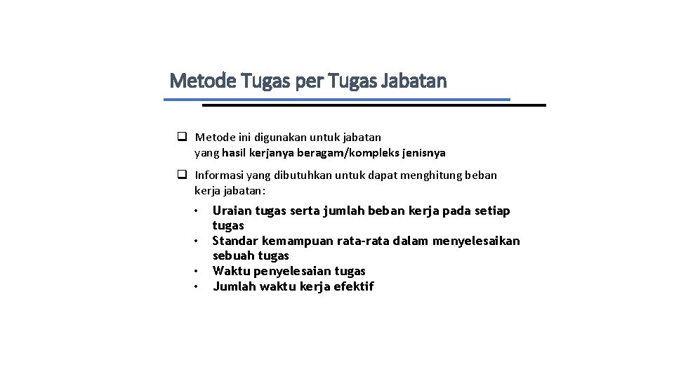 Metode Tugas per Tugas Jabatan q Metode ini digunakan untuk jabatan yang hasil kerjanya beragam/kompleks jenisnya q Informasi yang dibutuhkan untuk dapat menghitung beban kerja jabatan: • • Uraian tugas serta jumlah beban kerja pada setiap tugas Standar kemampuan rata-rata dalam menyelesaikan sebuah tugas Waktu penyelesaian tugas Jumlah waktu kerja efektif
