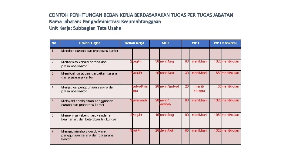 CONTOH PERHITUNGAN BEBAN KERJA BERDASARAKAN TUGAS PER TUGAS JABATAN Nama Jabatan: Pengadministrasi Kerumahtanggaan Unit Kerja: Subbagian Tata Usaha No Uraian Tugas Beban Kerja SKR WPT Konversi 1 Mendata sarana dan prasarana kantor 2 Memeriksa kondisi sarana dan prasarana kantor 2 keg/hr 30 menit/keg 60 menit/hari 1320 menit/bulan 3 Membuat surat usul perbaikan sarana dan prasarana kantor 2 usul/hr 15 menit/usul 30 menit/hari 660 menit/bulan 4 Menjadwal penggunaan sarana dan prasarana kantor 1 jadwal/min ggu 20 menit/ jadwal 20 5 Melayani peminjaman penggunaan sarana dan prasarana kantor 3 layanan/hr 20 menit/ layanan 60 menit/hari 1320 menit/bulan 6 Memeriksa kebersihan, keindahan, keamanan, dan ketertiban lingkungan 2 Keg/hr 45 menit/keg 90 menit/hari 1980 menit/bulan 7 Mengadministrasikan dokumen penggunaan sarana dan prasarana kantor 3 dok/hr 20 Menit/dok 60 menit/hari 1320 menit/bulan menit/ minggu 80 menit/bulan