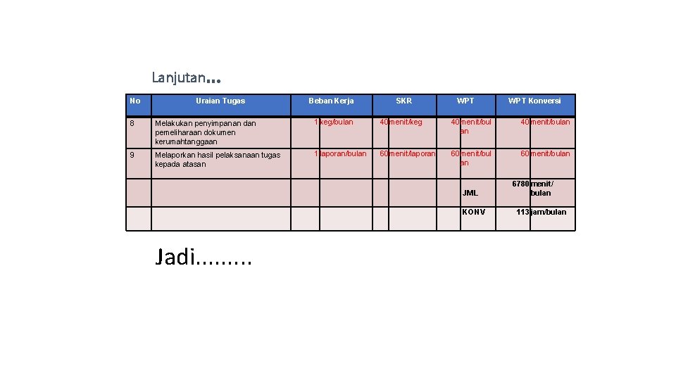 Lanjutan. . . No Uraian Tugas Beban Kerja SKR WPT Konversi 8 Melakukan penyimpanan dan pemeliharaan dokumen kerumahtanggaan 1 keg/bulan 40 menit/keg 40 menit/bul an 40 menit/bulan 9 Melaporkan hasil pelaksanaan tugas kepada atasan 1 laporan/bulan 60 menit/laporan 60 menit/bulan JML KONV Jadi. . 6780 menit/ bulan 113 jam/bulan