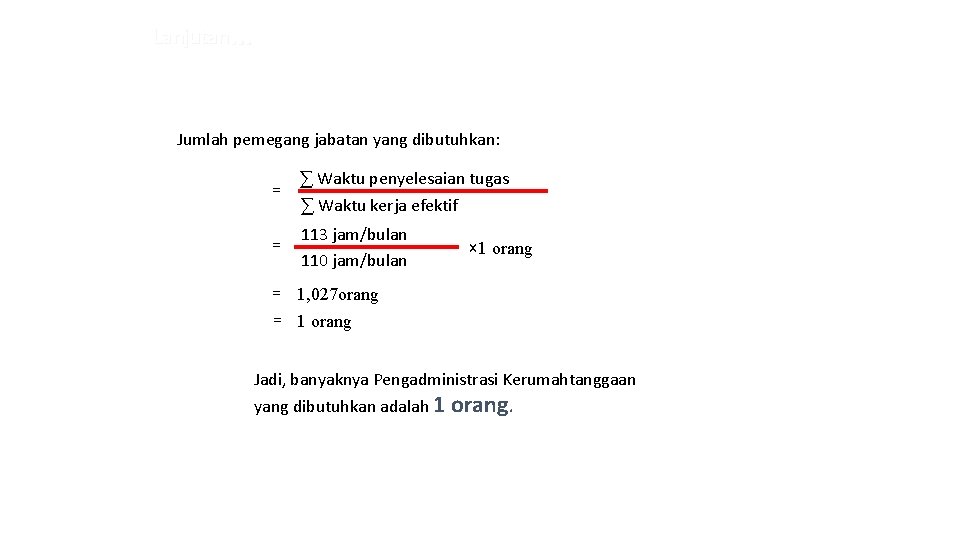 Lanjutan. . . Jumlah pemegang jabatan yang dibutuhkan: = ∑ Waktu penyelesaian tugas ∑ Waktu kerja efektif = 113 jam/bulan 110 jam/bulan x 1 orang = 1, 027 orang = 1 orang Jadi, banyaknya Pengadministrasi Kerumahtanggaan yang dibutuhkan adalah 1 orang.