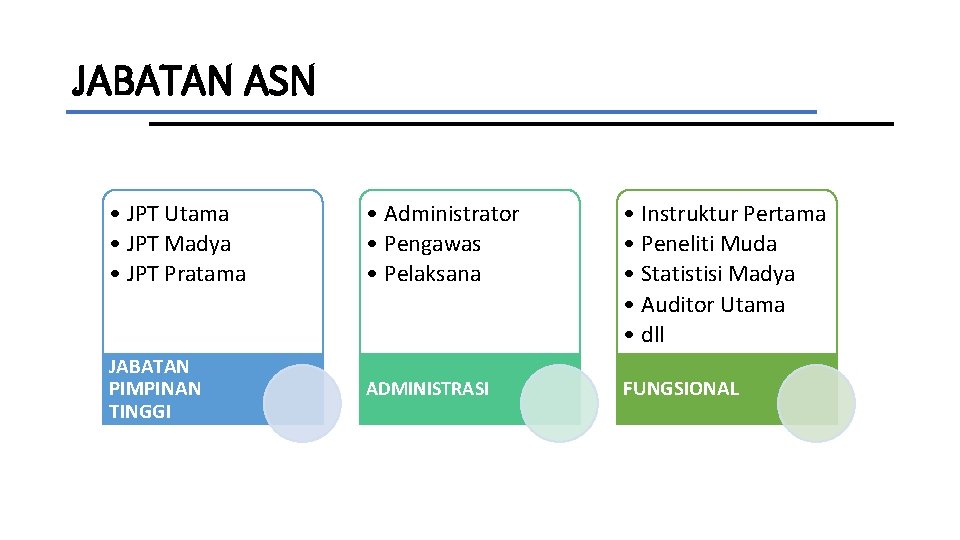 JABATAN ASN • JPT Utama • JPT Madya • JPT Pratama • Administrator • Pengawas • Pelaksana • Instruktur Pertama • Peneliti Muda • Statistisi Madya • Auditor Utama • dll JABATAN PIMPINAN TINGGI ADMINISTRASI FUNGSIONAL