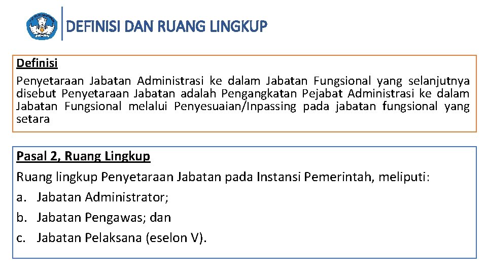 DEFINISI DAN RUANG LINGKUP Definisi Penyetaraan Jabatan Administrasi ke dalam Jabatan Fungsional yang selanjutnya disebut Penyetaraan Jabatan adalah Pengangkatan Pejabat Administrasi ke dalam Jabatan Fungsional melalui Penyesuaian/Inpassing pada jabatan fungsional yang setara Pasal 2, Ruang Lingkup Ruang lingkup Penyetaraan Jabatan pada Instansi Pemerintah, meliputi: a. Jabatan Administrator; b. Jabatan Pengawas; dan c. Jabatan Pelaksana (eselon V).