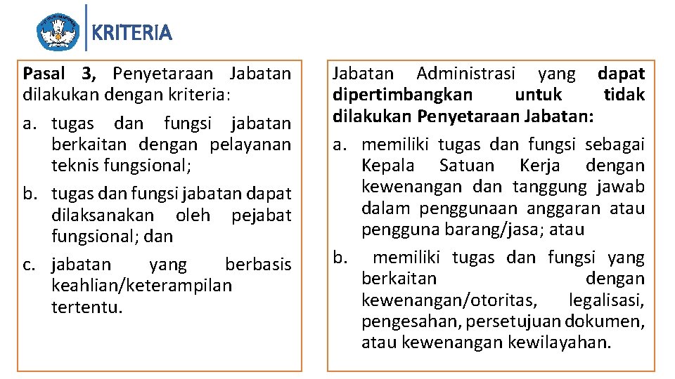 KRITERIA Pasal 3, Penyetaraan Jabatan dilakukan dengan kriteria: a. tugas dan fungsi jabatan berkaitan dengan pelayanan teknis fungsional; b. tugas dan fungsi jabatan dapat dilaksanakan oleh pejabat fungsional; dan c. jabatan yang berbasis keahlian/keterampilan tertentu. Jabatan Administrasi yang dapat dipertimbangkan untuk tidak dilakukan Penyetaraan Jabatan: a. memiliki tugas dan fungsi sebagai Kepala Satuan Kerja dengan kewenangan dan tanggung jawab dalam penggunaan anggaran atau pengguna barang/jasa; atau b. memiliki tugas dan fungsi yang berkaitan dengan kewenangan/otoritas, legalisasi, pengesahan, persetujuan dokumen, atau kewenangan kewilayahan.