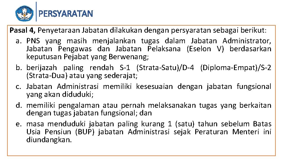 PERSYARATAN Pasal 4, Penyetaraan Jabatan dilakukan dengan persyaratan sebagai berikut: a. PNS yang masih menjalankan tugas dalam Jabatan Administrator, Jabatan Pengawas dan Jabatan Pelaksana (Eselon V) berdasarkan keputusan Pejabat yang Berwenang; b. berijazah paling rendah S-1 (Strata-Satu)/D-4 (Diploma-Empat)/S-2 (Strata-Dua) atau yang sederajat; c. Jabatan Administrasi memiliki kesesuaian dengan jabatan fungsional yang akan diduduki; d. memiliki pengalaman atau pernah melaksanakan tugas yang berkaitan dengan tugas jabatan fungsional; dan e. masa menduduki jabatan paling kurang 1 (satu) tahun sebelum Batas Usia Pensiun (BUP) jabatan Administrasi sejak Peraturan Menteri ini diundangkan.