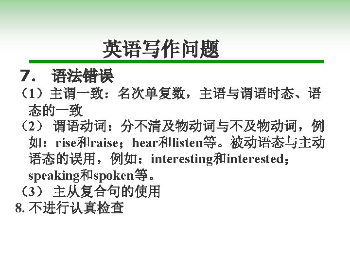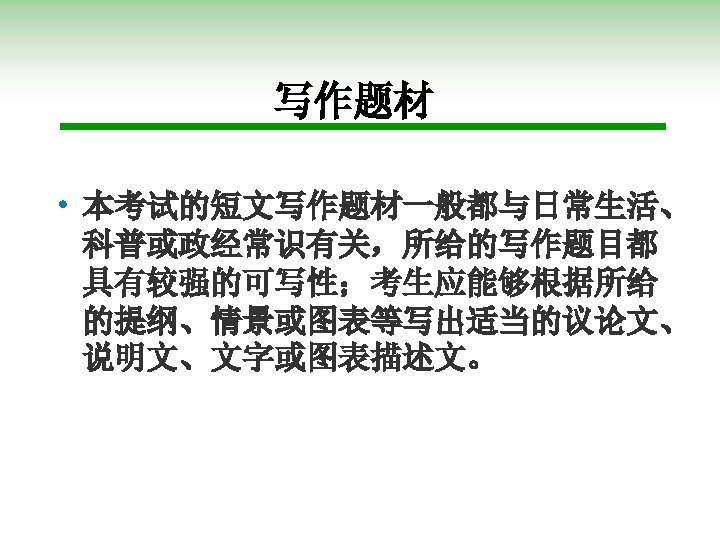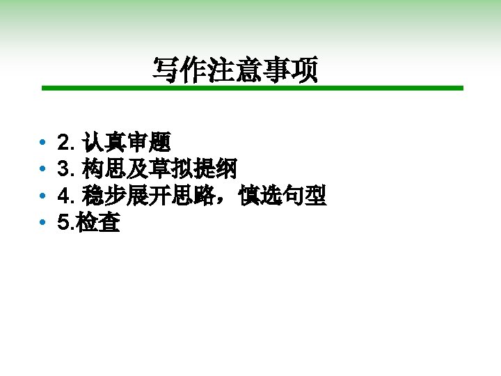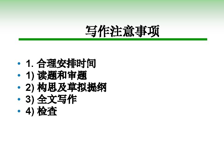 段落主题句 • 段落主题句要清楚、明确 Computer is very important The computer plays an educational role in our daily life. Big cities have traffic problems Traffic problems in big cities are serious, which can be found in several ways.