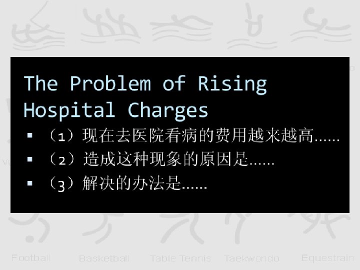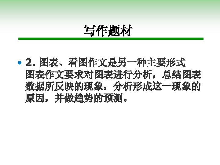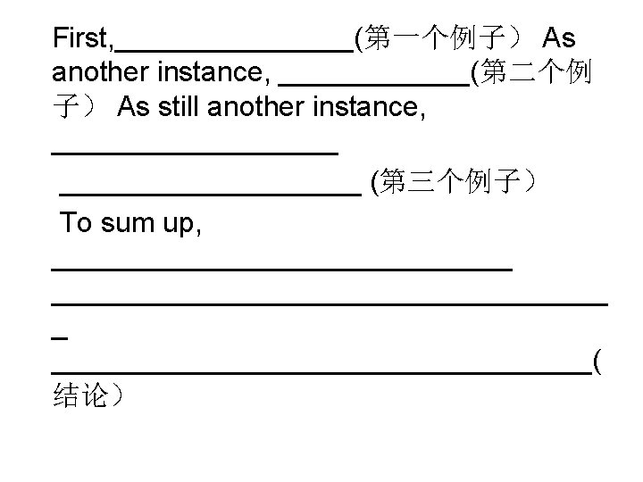 第二段 There are several possible reasons for …In the first place, …Let’s have an example to illustrate the great increase in… Second, …. Finally, …There may be some other factors responsible for… But it is generally believed that the above mentioned reasons are commonly acceptable.