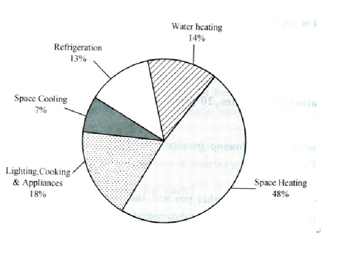 From the circle, we can see that space heating takes up the most energy consumption, it accounts for 48% of the total amount of energy. The second largest portion of energy (18%) is used for lighting, cooking, and running appliances. This is followed by water heating which expend 14% of the total. Refrigeration almost ranks the same as water heating, which is 13% of the whole amount of energy use. Among these energy consumption items, space cooling comes up to be the lowest, 7% of the whole. This circle shows that the largest portion of energy is spent on space heating. This puts us into deep thinking.