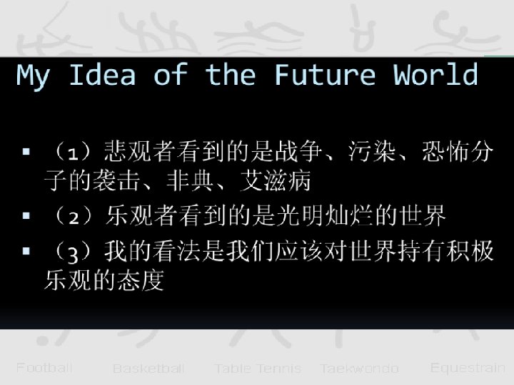 For one thing, I greatly admire the role of lawyers in TV plays of Hong Kong. From my point of view, they are very powerful, decisive, and responsible. And I am also eager to be such a person. For another, a lawyer usually has an abundance of income. That will give me a comfortable living condition. The prime factor is that I hope to be a white-collared clerk in a foreign-funded enterprise. Maybe, that hope is related to my personality. I am an extrovert girl and like to argue what is right and what is wrong.