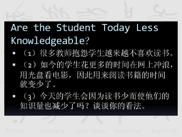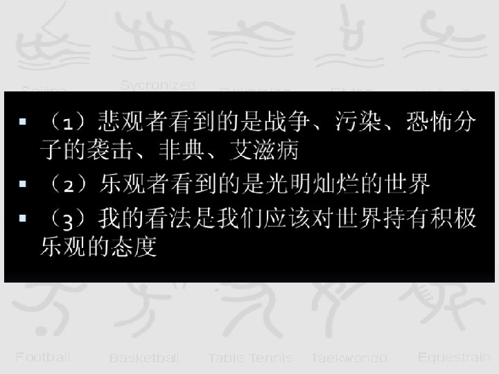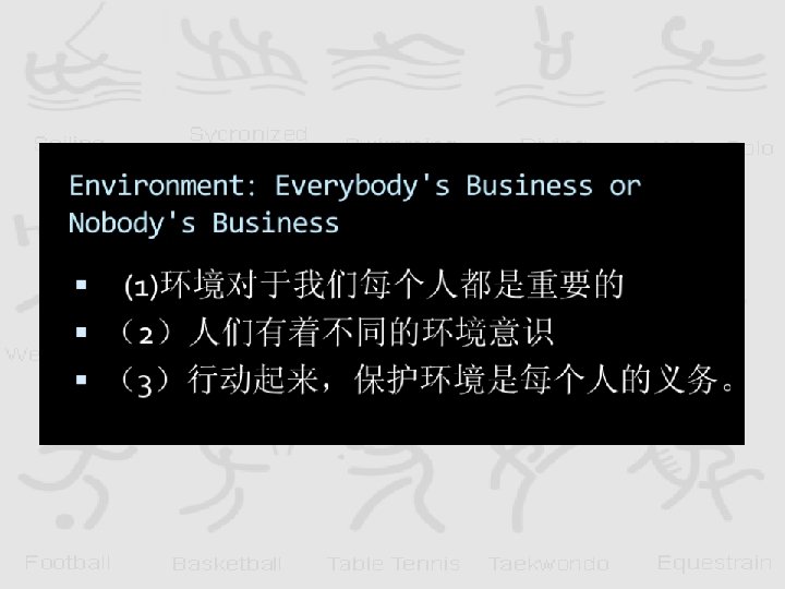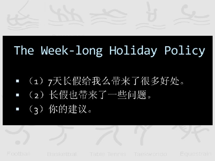 • Practice Makes Perfect • There is an old saying in China: practice makes perfect. Practice is means and perfect is goal. Only when you do more practice can you make things perfect. This is true not only in our learning but also in other walks of life. • When we study English, we have so much to learn such as grammar, vocabulary and so on. In order to learn them well, we need do more practice. We must read a lot, write a lot and listen to a lot. Only after we have done more practice can we have a good command of it.
