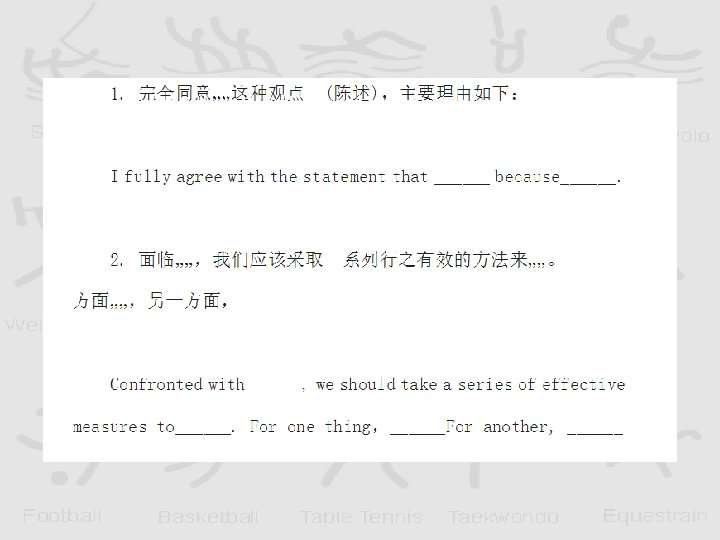 Example : An English proverb says, / One of the great men once remarked, “Haste Makes Waste”. / Nearly every civilization has its own equivalent to the proverb: …… It means that…… In other words, …… History/Our society abounds with the examples of “Haste Makes Waste”. ……. On the other hand/On the contrary, ……. For us college students, the saying/proverb has a profound and realistic significance: …….
