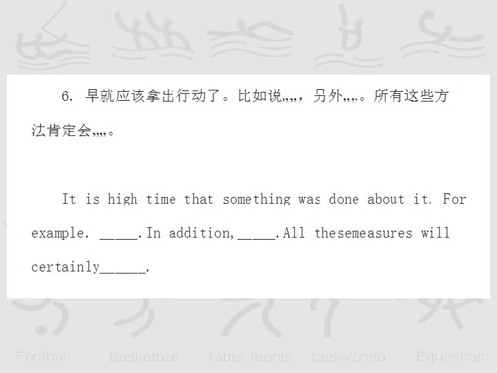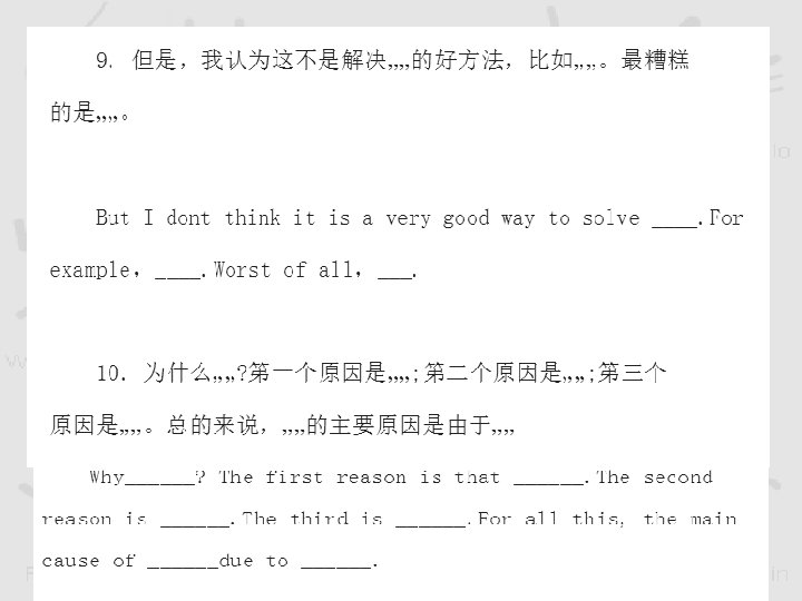 问题解决型/方法途径型套路 _____________(目前 的现象及存在的问题)Many ways can contribute to ______(要解决的问题), but the following ones may be most effective. One of these is that_______(第 一种方法)Another approach is ____________(第二种方法) Furthermore, ________(第三种方法) In conclusion, these are not the only three points you should pay attention to. But it should be noted that__________