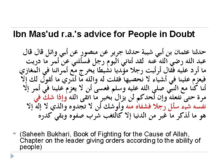 Narrated Abdullah Ra: Today a man came to me and asked me a question which I did not know how to answer. He said, "Tell me, if a wealthy active man, well-equipped with arms, goes out on military expeditions with our chiefs, and orders us to do such things as we cannot do (should we obey him? )" I replied, "By Allah, I do not know what to reply you, except that we, were in the company of the Prophet and he used to order us to do a thing once only till we finished it. And no doubt, everyone among you will remain in a good state as long as he obeys Allah. If one is in doubt, he should ask somebody who would satisfy him, but soon will come a time when you will not find such a man. By Him, except Whom none has the right to be worshipped. I see that the example of what has passed of this life (to what remains thereof) is like a pond whose fresh water has been used up and nothing remains but muddy water. "