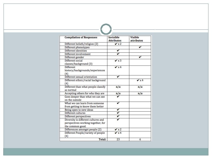 Question #2: How would you define diversity? GOAL: TO SEE HOW STUDENTS DEFINED DIVERSITY AND WHETHER OR NOT THEY USED VISIBLE OR INVISIBLE ATTRIBUTES IN THEIR DEFINITION