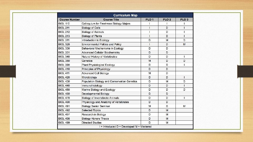 Mapping • Why is this important? • Mapping demonstrates the relationship between learning and curriculum sequencing • Mapping demonstrates the alignment between the courses and the PLOs (and ILOs and Core Competencies)
