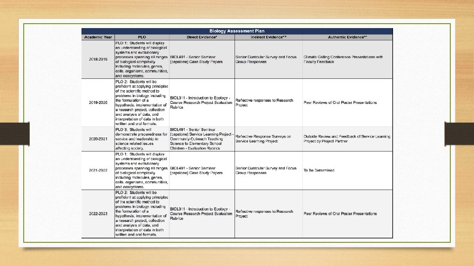 5 year Assessment Plan completed at the start of the cycle • OIE will need completed, updated assessment plans from the last completed program review to the next scheduled program review. • Assessment Plan: This 5 -year plan demonstrates what year you will assess each PLO, and what direct and indirect assessment work you will use to measure the PLO.