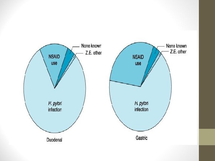 NSAIDs associated PU: Chronic use of NSAIDs suppresses mucosal prostaglandin synthesis by blocking COX-1 and COX-2 Zollinger-Ellison syndrome associated PU: Excess gastrin secretion by tumor and hence excess gastric acid production • Cigarette smoking impairs mucosal blood flow and healing. • Corticosteroids in high dose and with repeated use promote ulcer formation • Too-rapid gastric emptying, exposing duodenal mucosa to an excessive acid load